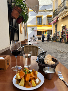 During my time abroad I also met some beautiful souls from all over the world. Networking was easy in Spain as the atmosphere of life in Sevilla cultivates exciting conversation, especially over tapas and a glass of wine, which are essential pieces to nearly every social event in Spain. I quickly learned that the warmness of the culture towards socialization leads to quick connections. I appreciated the joy that came with every meal and get together that was always filled with laughter and intriguing conversation. Each opportunity I got I challenged myself to speak to locals whether that be the local tapas bars, festivities, or corner stores I struck conversation with Sevillans, immigrants, and tourists throughout my time in Spain. Sevillans were happy to make recommendations of things to do or try in their beloved town. Every corner of the city offered a new local gem just waiting to be discovered. Depicted below are some of my favorite memories exploring the streets of Sevilla that are lined with tapa bars, markets, and the iconic orange trees.